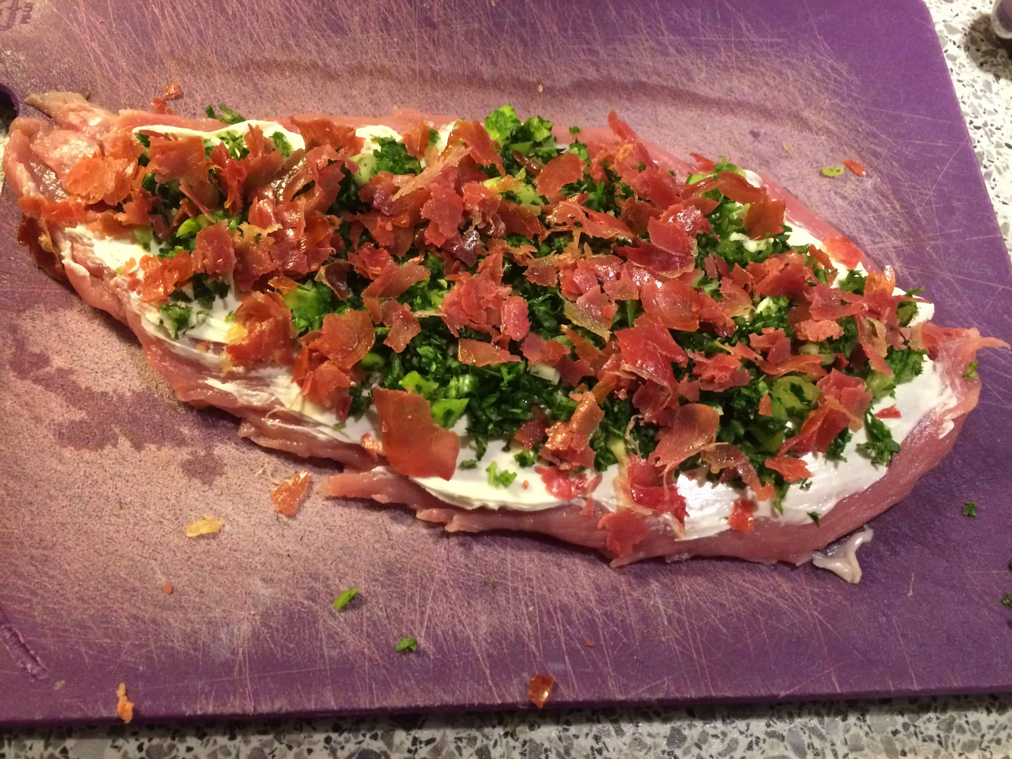 Skær mørbraden op og bank den flad mellem to fryseposer – brug en tung ikke for stor gryde eller en kødhammer. Skyl og hak persillen groft. Krydr mørbraden indvendigt og udvendigt med salt og peber. Smør creme cheesen i et tyndt lag på mørbraden og drys med persille og serranoskinken revet i mindre stykker. Rul kødet sammen og snør dem med snor.