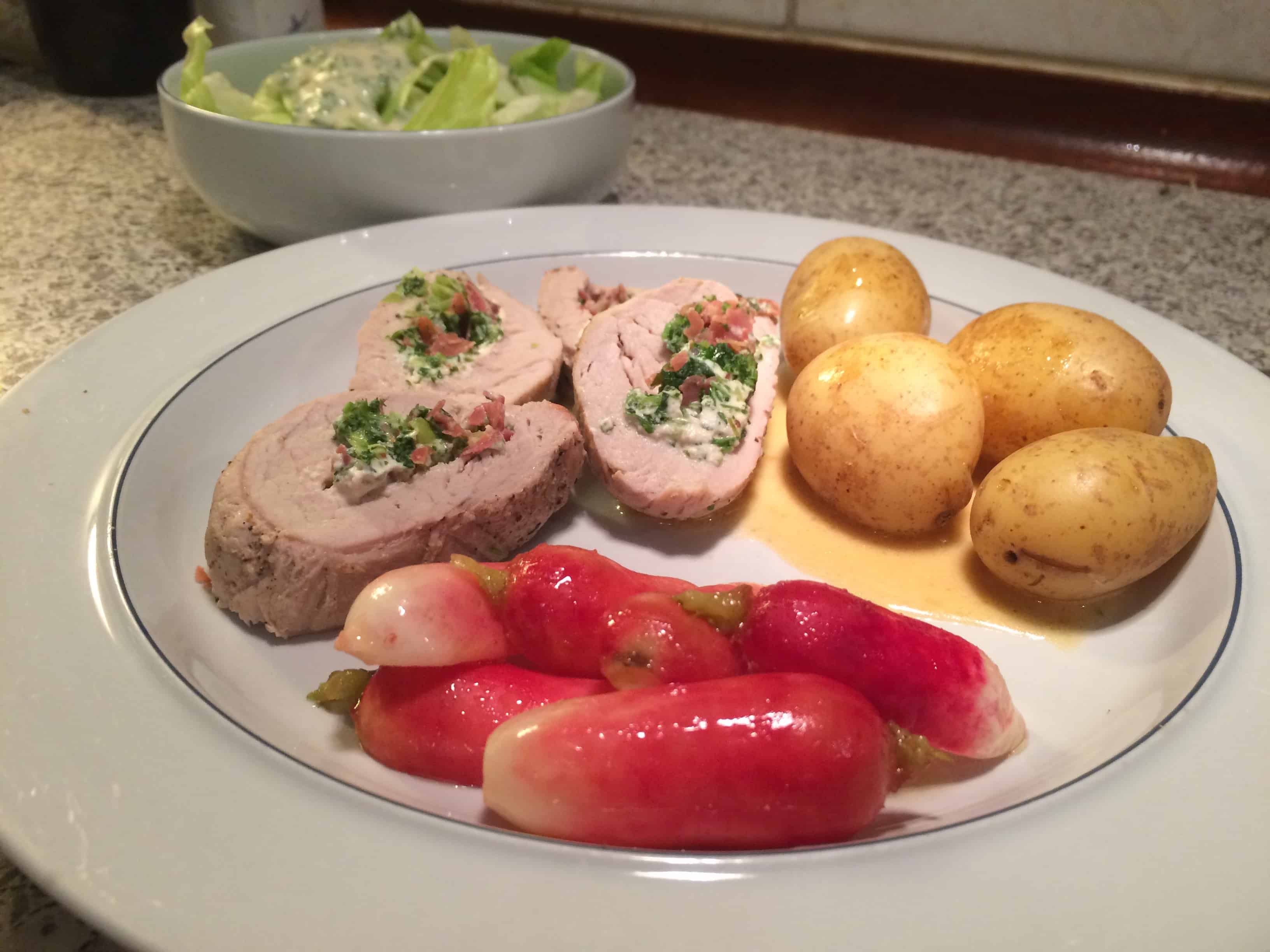 Svinemørbrader er nogle herlige størrelser. Man kan putte så mange forskellige ting i dem. I dag havde jeg persille, creme cheese og serranoskinke ved hånden, så det var hvad jeg kom i. Nu sidder der sikkert en herre eller to og tænker: “Hun skulle da have svøbt dyret i skinke, ikke brugt skinken som fyld! Uhh eller måske begge dele!”. Det kan man jo bestemt også, men nu havde jeg altså kun lige et par skiver serranoskinke ved hånden og så improviserede jeg – og det smagte dejligt 😀 De lune radiser er et rigtig godt modspil til kødet. Prøv det!